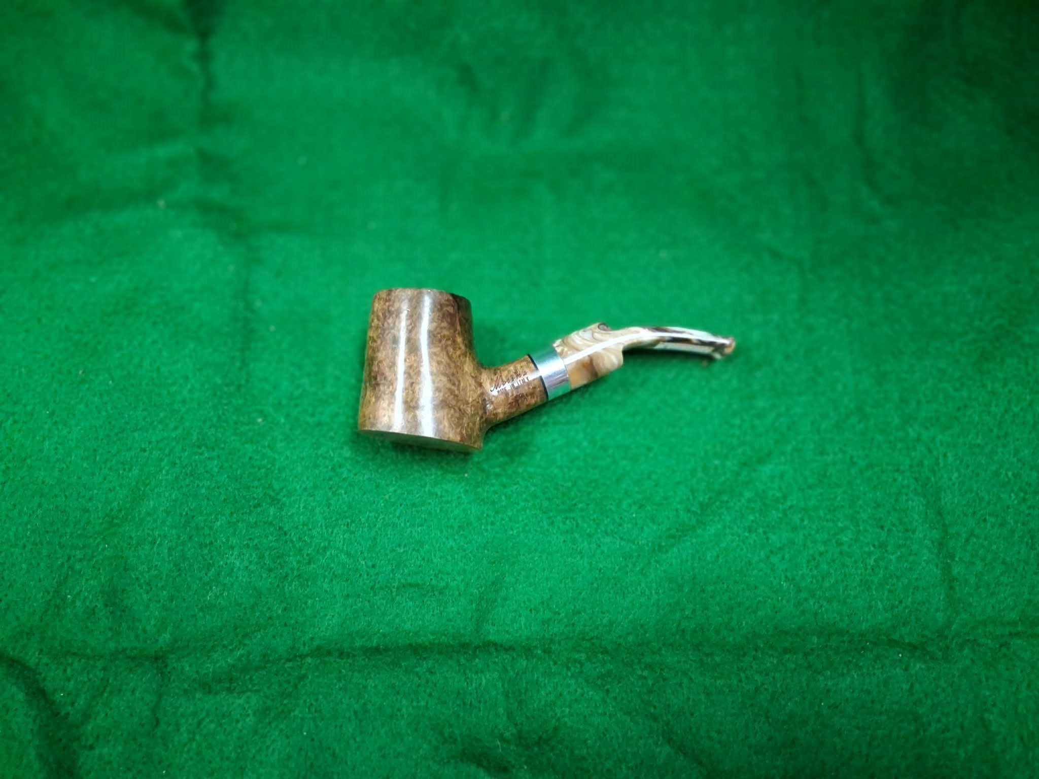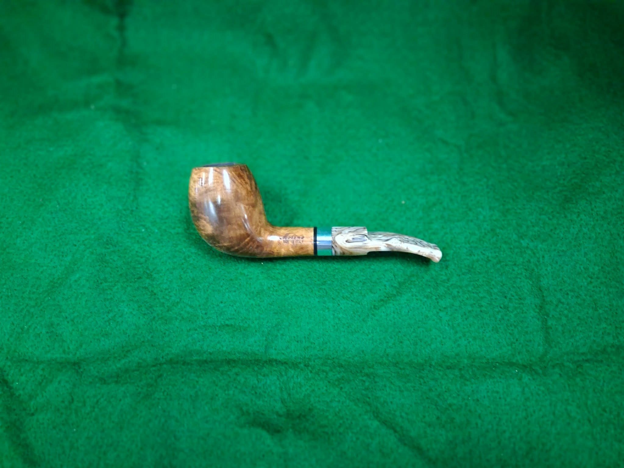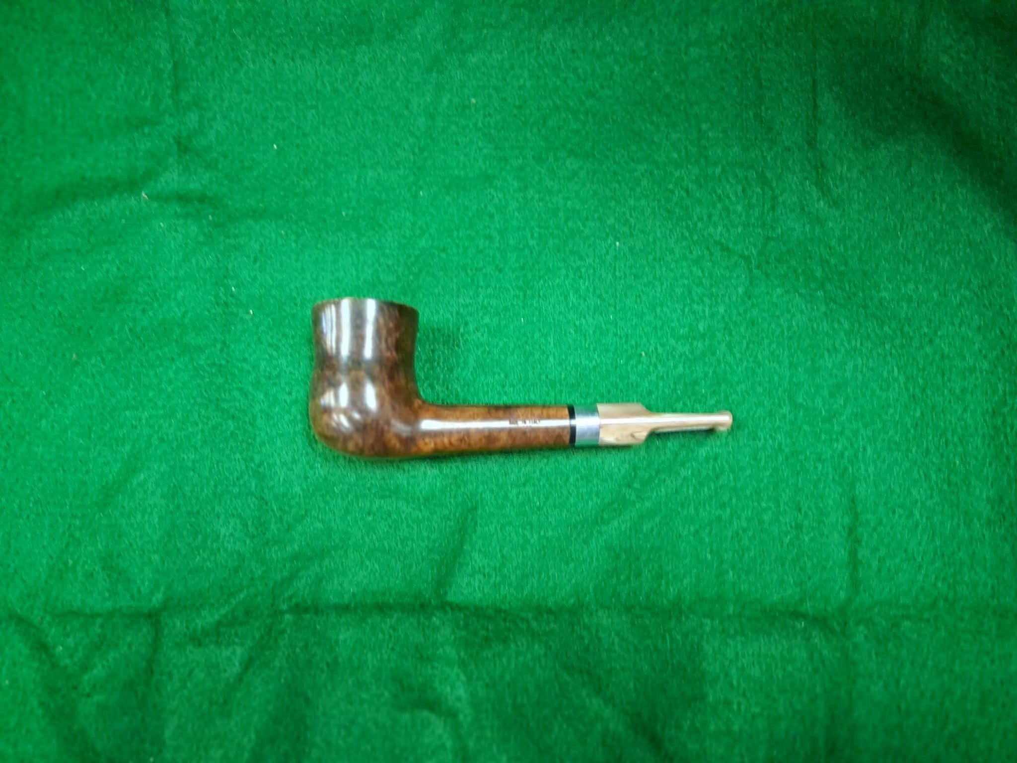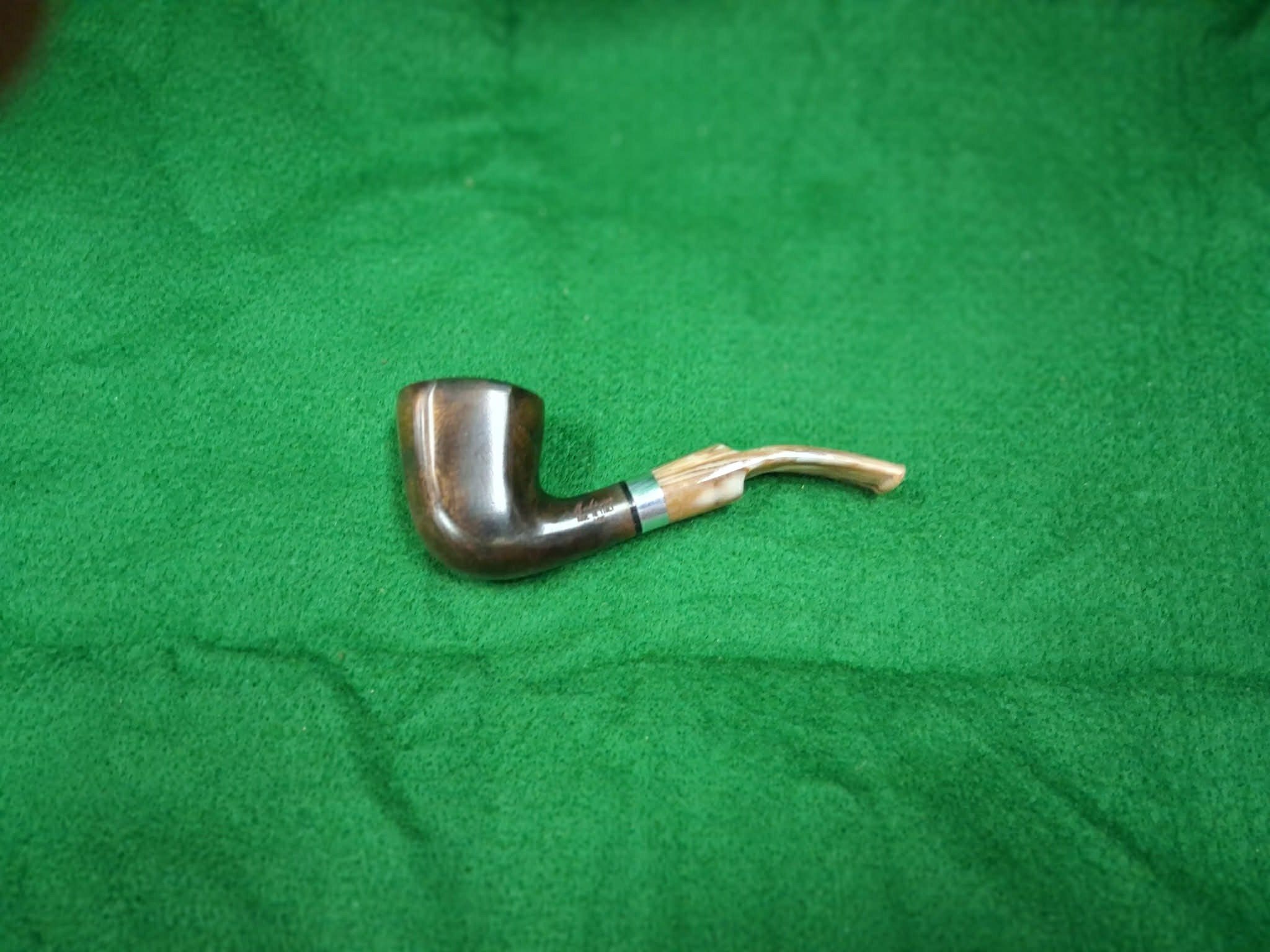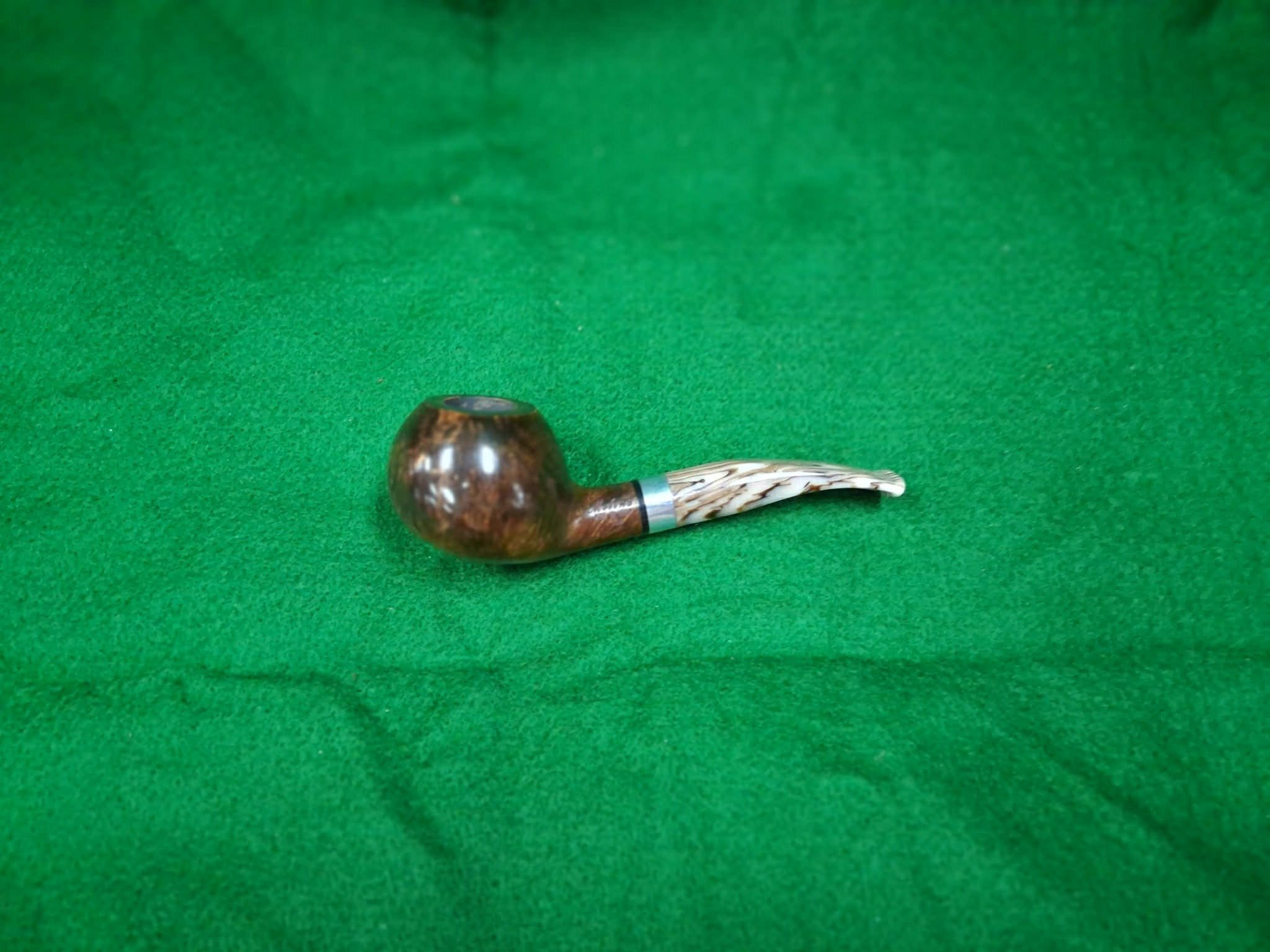 Dark smooth Italian pipe with a beautiful marbleized lucite stem. Approximately 5 1/2 inches long.